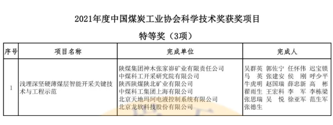 龍軟科技參與完成的“淺埋深堅硬薄煤層智能開采關(guān)鍵技術(shù)與工程示范”獲得特等獎、龍軟科技主導(dǎo)完成“綜采工作面智能化自適應(yīng)采煤關(guān)鍵技術(shù)研究及系統(tǒng)應(yīng)用”、“田陳煤礦安全生產(chǎn)過程VR仿真培訓(xùn)平臺研發(fā)與應(yīng)用” 分獲一等獎和三等獎。